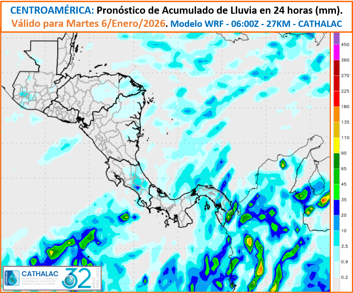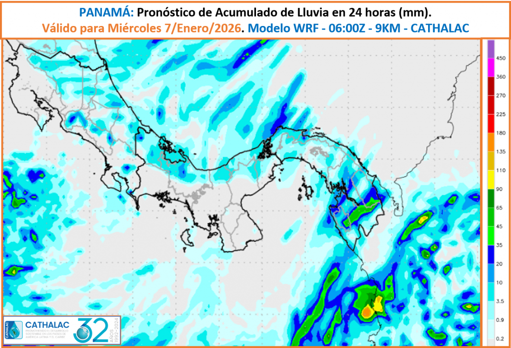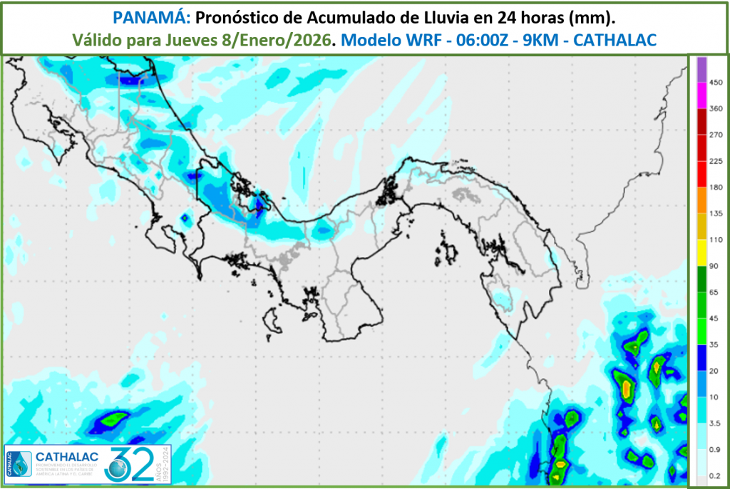 Pronóstico de acumulado de lluvia en 24 horas, válido para Jueves 8 de Enero 2026